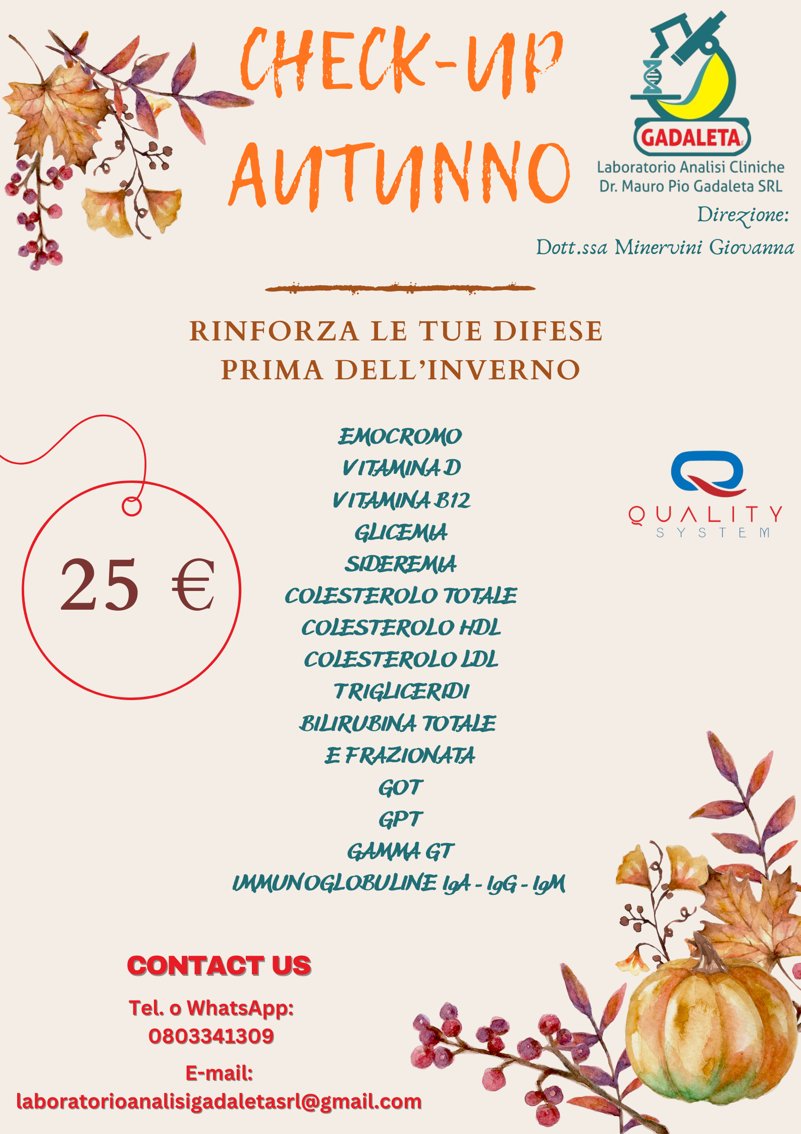 Il laboratorio Mauro Gadaleta SRL offre diverse tipologie di checkup che consentono di monitorare la tua salute.